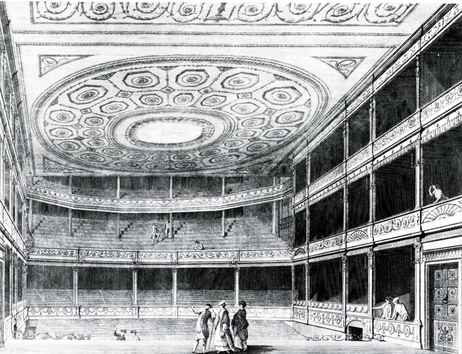 By 1822 it was realized that Wyatťs 33-foot proscenium was too narrow for the width of the house, and the entire auditorium was then virtually rebuilt by Samuel Beazley. Although the semicircular brick constructional frame was retained,the tiers were now reshaped to form a horseshoe, in the eighteenth-century Italian manner. The stage opening was widened and on each side a giant order of Corinthian columns, supporting an entablature, was built to frame the three new stage boxes - again a feature common in eighteenth- and early nineteenth-century Continental theatres.