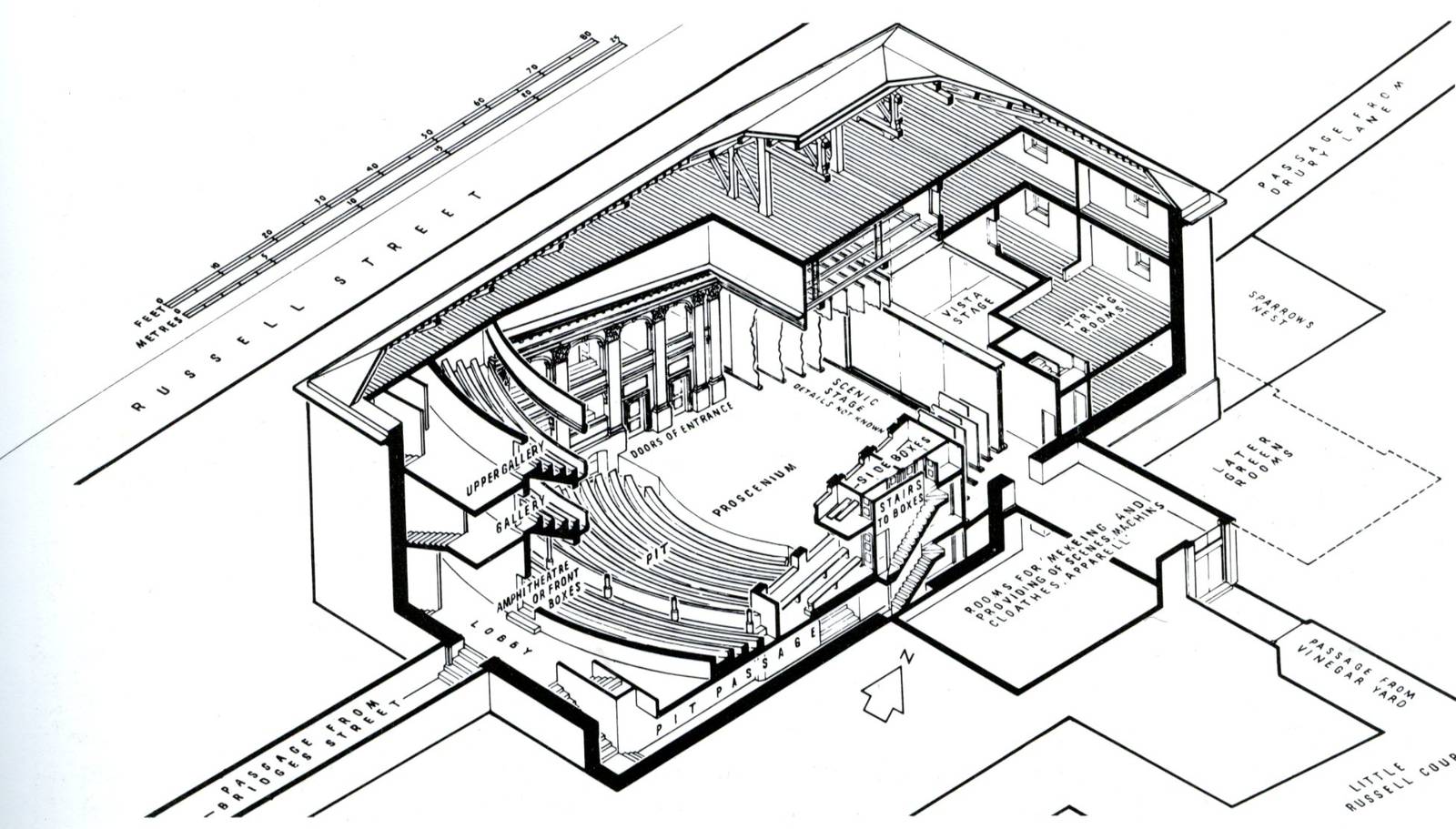 Drury Lane bylo jedním z nejdůležitějších divadel Londýna až do konce 17. století. Typický anglický parter nebyl rovný jako ten francouzský, ale svažoval se směrem k jevišti, aby diváci měli lepší výhled, navíc byl opatřen lavicemi. Jeviště bylo rozděleno portálem na dvě stejné části. Předscéna vybíhala do prostoru hlediště. Jeviště se zvedalo od předscény až k zadnímu kraji. Londýnská divadla 17. stol. byla poměrně nízkokapacitní. Na obrázku je znázorněna podoba divadla v roce 1808. jedná se o Sheridanovu přestavbu.