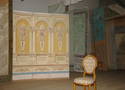 Zhruba uprostřed stěny naproti lávce jsou umístěny dveře, vedoucí do místnosti v patře, kde se skladovaly dekorace. U spodního okraje těchto dveří je osazen subtilní rumpál, od něj dolů až ke dveřím z jeviště do chodby je ve zdi osazeno široké prkno.