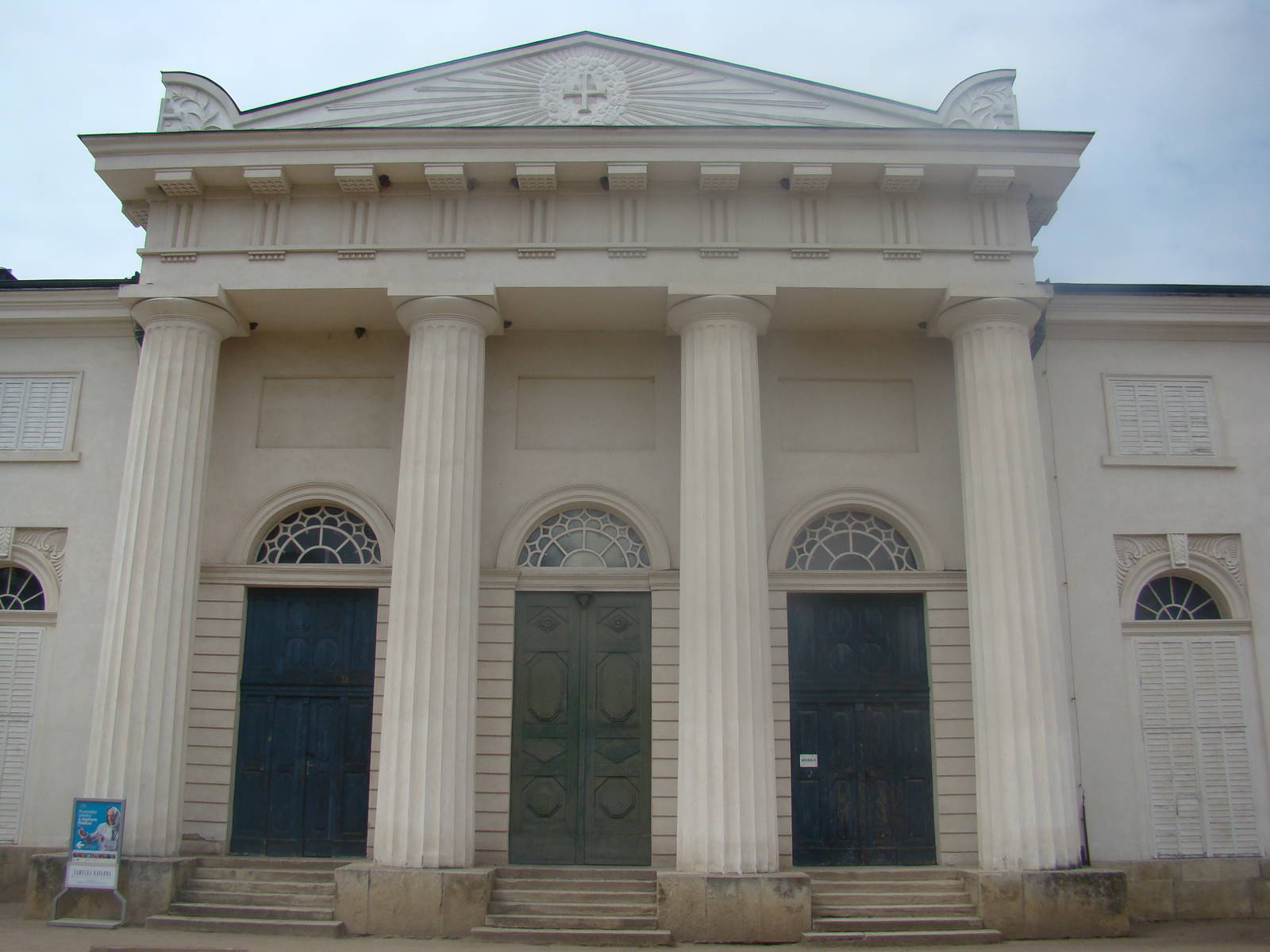 Pavilón s divadlem a nedokončenou kaplí se jako celý zámek obrací hlavním průčelím k západu. S hlavní zámeckou budovou jej spojuje kolonádové křídlo, na jehož konci se vstupuje do chodby vedoucí podél kaple k divadlu. Střední část hlavního průčelí pavilónu je zdůrazněna dórským portikem se čtyřmi sloupy, kladím a štítem s akrotérii. Z trojice dveří mezi sloupy, ke kterým vedou krátká schodiště, jsou střední slepé, těmi vpravo se pak vstupuje do hlediště divadla. Zadní část jeviště je přístupná dalšími dveřmi v severní stěně.