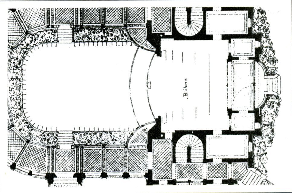 Auditorium: Glaswindows destroyed by fire. Iron construction in plastic folies.