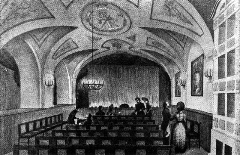 The theatre hall was a narrow, long hall of a rectangular plan in the first floor of a rental house, arched by a Baroque lunette vault. With their own work, the amateur actors built here a simple wooden stage of roughly 30 m2 dimension that occupied around a third of the length of the room. The height of the room didn't allow the stage to be raised too high. Similarly, they also acquired costumes and scenery sets, some of which were painted by Tyl himself. A scaffolding for attaching set pieces, soffits and backdrop was installed in the stage. There were about ten rows of benches in the auditorium that could have been filled by 80 spectators and other 100 standing rooms. The distribution of volumes was inducing rather a cramped impression and when the room was filled with people, it was quickly hard to breathe. Also the location of the theatre was in a distance from the clientèle, to which it was dedicated to. For the Lower Side with many aristocratic palaces didn't accommodate many Czech speaking inhabitants and it was quite far away from the centres of Czech community at the Old and New Town.