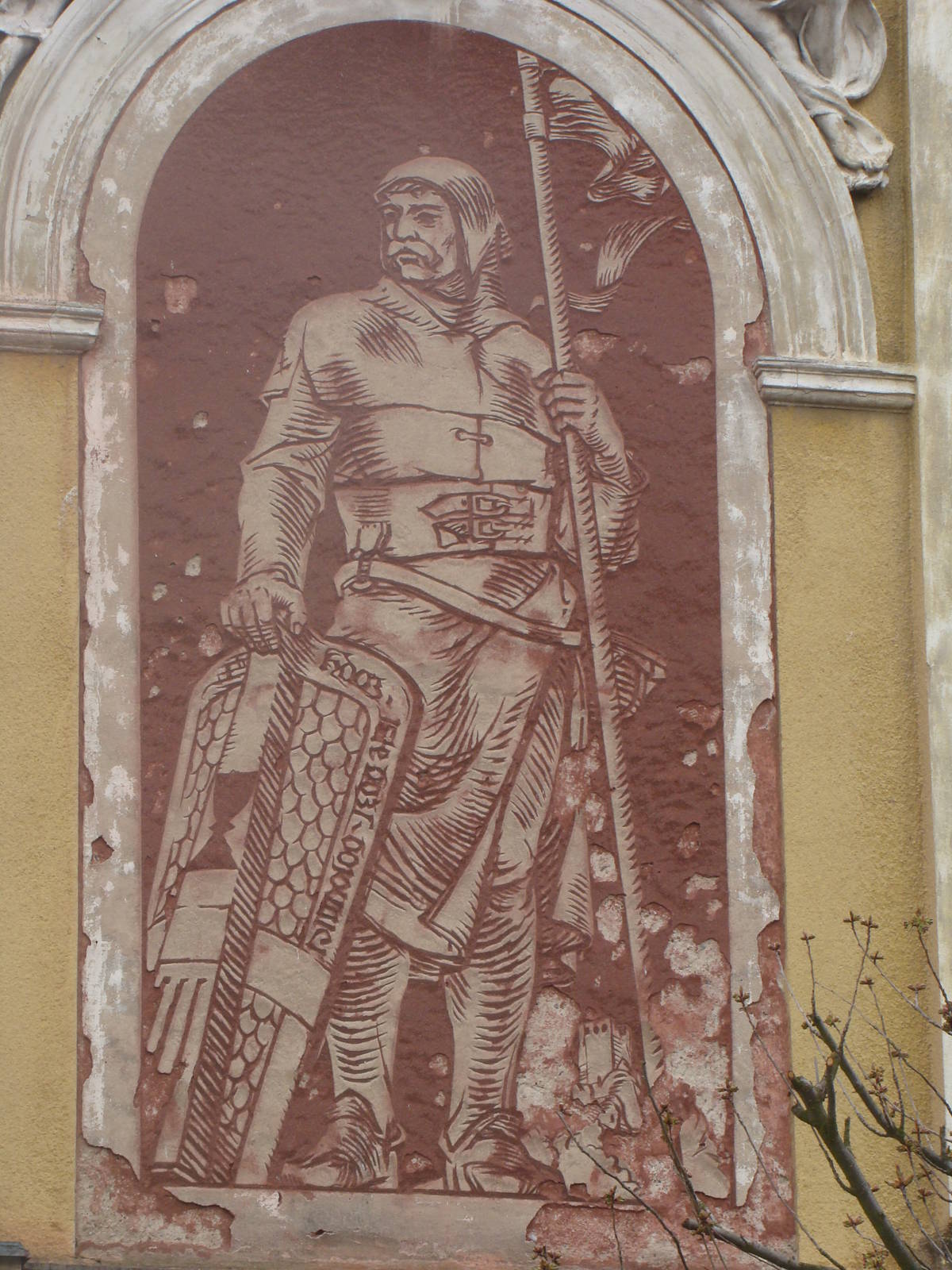Requested survey by Technická správa (Technical administration) in Mnichovo Hradiště from January 1951 firmly rejected planned knocking of historicising decoratipn down from town hall facades. According to it, empty surfaces after walled up windows could accommodate for instance mosaic with theme  “ Forward to the construction of Socialism”. Fišer brothers might  not have a large contribution on the realized state, carried out probably not until 1955, historicising framing have remained and sgraffiti in the style of Socialist Realism appeared on the surfaces after walled up windows. Planned changes of the entrance into a stage part  in the middle of the north facade have remained unexecuted.