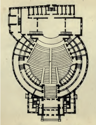 Volkstheater (People's Theatre) of Worms was designed by Otto March. Its origins go back to 1883 when, as part of the local Luther Festival, a play was performed in a large room, since there was no proper theatre available in the city. One of the managers was Friedrich Schoen, a friend of Wagner's, who at once saw the relevance of it, and suggested embodying the same principles in a permanent building. A People's Theatre it really was, since it was paid for by public subscription, and there was nothing quite like it in Europe. March made the main body, the auditorium, circular, following the model of circuses. In section it was like a centralized church, with low 'aisles' surrounding a high clerestoryed 'nave' crowned by a dome. The foyers were at one end, the stage accommodation at the other. The stage itself projected into the audience. Seating was arranged in a fan shape, as at Bayreuth. Boxes were practically dispensed with, and round the upper level ran a gallery, or promenade, opening on to the central space through wide arches—a feature characteristic of variety theatres. There was a large skylight in the dome, so that it could be used by day. Fire-conscious critics were pleased to note that 'in an experimental trial the auditorium was emptied of 1,400 children in forty seconds'. The facade was made Romanesque, presumably to harmonize with the cathedral nearby.