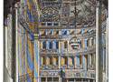 The decoration of the house, which is remarkably neat and chaste, is by Redouté. The front of the balcony presents scenes taken from the best French pieces. The first and second boxes are ornamented with blue draperies and red cameos. The ceiling is painted in arabesques composed of flowers of bright colours, and the ornaments of the stage-boxes are enriched with gold. In the tym-panum of the proscenium Apollo is seen crowning the Muses.
