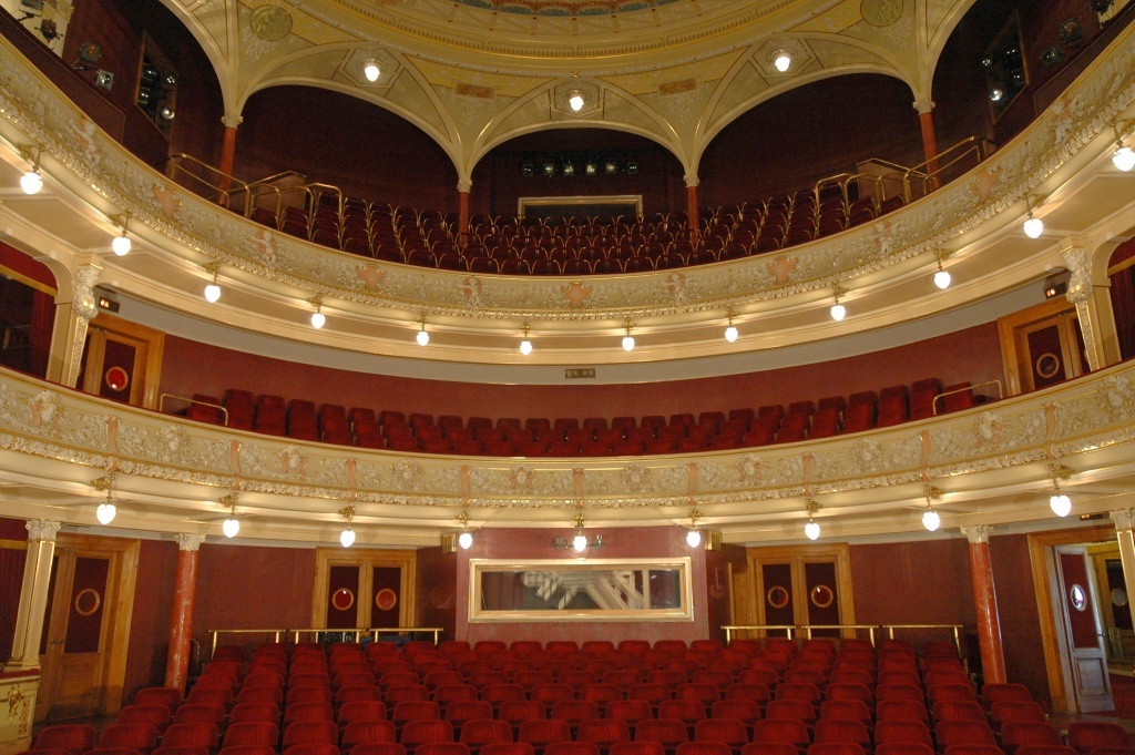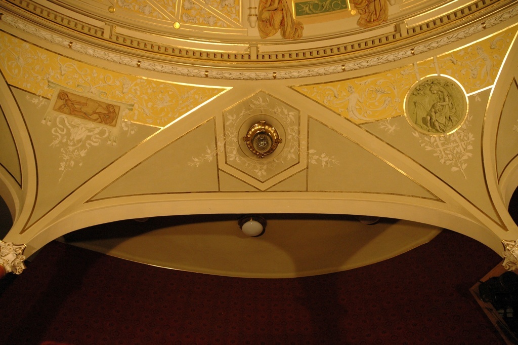 The auditorium of wide U- plan is moderately close to a horseshoe shape with thin narrowing in the front segment (in the level of proscenium boxes).  Theatre capacity   is 1 000–1 150 of spectators’ seats, distributed  in the stalls, dress and upper circle and in the upper balcony . Eight side boxes could be accommodated  in the stalls, ten in  the dress and upper circle each; upper circle boxes  are completely opened,  mutually parted only by low divisions. Wide amphitheatres take up the centre of both the circles, the upper circle is confined to the central amphitheatre. Circles and boxes were provided by a continuous parapet decorated by a grotesque relief. The ceiling, evolved from a circular base, passes to wide cavetto, opened in front of the upper circle by an arcade of five depressed arches on thin iron piers with Corinthian-like capitals.