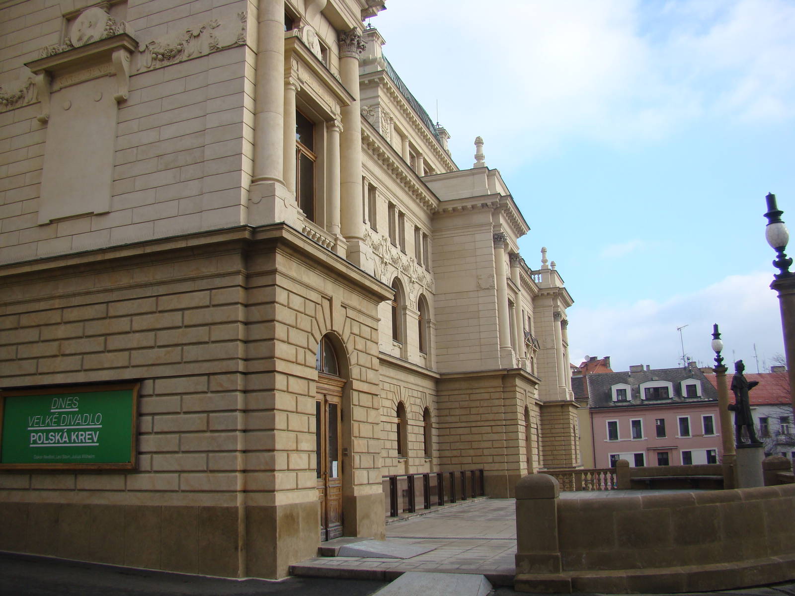 Window spandrels are filled by allegorical figurative reliefs, thematically combined into pairs: Love and  Jealousy (by Antonín Procházka), Enthusiasm  and Self-sacrifice (by Stanislav  Sucharda) and  Heroism and Destiny (by  Myslbek´s desiciple  František  Stránský). A screened terrace, covered by a balustrade, is concealed above the crown moulding  with   massive dentils. The upper recessed segment of the building grows out of it crowned by a triangular gable, the keystone of a Diocletian window carries a head of   Apollo in its tympanum. Sculptures of dancing puttos by František Hergesel  are inserted into gable ends and there is a lyre in the top. Pedestals carry  relief inscriptions (Drama and Opera) and two sculpture groups by sculptor Ladislav Šaloun above the cornice of the bay. Drama is  personified by a group of  old women with snakes in their hair, a young man and a wyvern monster, Opera is represented by a  half naked girl with a lyre, a naked boy and a swan are gathered around  her on sides. Lateral, thirteen bay facades are rhythmized by three  bays of a staircase wing  repeating bay segmentation  of the front facade. We can find portraits of Czech playwrights and music composers in circular medallions above the actual and blank windows on the facades. František Rous created   portraits of Jan  Nepomuk  Štěpánek , Karel Bendl, Hynek  Palla, Václav  Kliment  Klicpera, Emanuel  Bozděch  and Jana Kollár  (on the theatre frontage) and Vilém Amort created   portraits of Vítězslav  Hálek, Bernard Guldener, František Věnceslav  Jeřábek, František Škroup and Vilém Blodek.