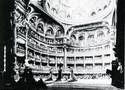 Victor Louis was a brilliant and interesting man, a friend of Beaumarchais and Mme Geoffrin, who had studied at Rome, built a palace in Warsaw and made additions (now regretted) to Chartres Cathedral, before returning to Bordeaux in 1772. The story of his long and acrimonious dealings with the city council during the next eight years reminds one strongly of the building of Blenheim. Like Vanbrugh, he was forced to relinquish control before the building was finished and departed to Paris embittered and angry. A request for a pension was turned down with the excuse that he had already involved the city in unnecessary expense with his 'peristyles and painted ceilings'. For the facade, in fact, Louis had adopted the simplest and grandest of all motifs, a long colonnade of twelve tall Corinthian columns supporting a flat entablature. Originally the ground sloped up so that carriages could drive inside this colonnade. It is continued round the side elevations as a pilaster order. Upon entering, one finds oneself in a low vestibule supported on Doric columns, which leads to the grand staircase hall —one of Louis' boldest ideas, the importation into a theatre of a feature hitherto mainly characteristic of palaces. The hall itself rises to the whole height of the building and is covered by an oblong domical vault ending in a skylight. To left and right the elevation consists of an arched, rusticated ground storey and a gallery of Ionic columns. In the centre the staircase ascends until it meets the far wall where a door flanked by caryatids leads into the Grande Sails, the auditorium; then it divides left and right and goes up to the gallery. Above the cornice, lunettes cut into the panels of the vault reveal a view of small domes over the galleries. Over the low vestibule, just as at Soufflot's Lyons theatre, is an oval concert hall. The Grande Salle itself looks to Italy rather than to Versailles or Besancon, but its originality is immediately apparent. Louis rests his domed ceiling on four main supports forming a square. Two of them coincide with the sides of the proscenium arch; the other two are giant Ionic columns which divide the auditorium into three segments. These segments are articulated by further Ionic columns, holding three rows of 'boxes, so that at first sight they form a continuous colonnade, i.e. the motif of Caserta. But above the cornice the three segments become galleries under wide segmental arches. The plinth of the whole colonnade is a solid rusticated wall. The stage is framed by the usual paired columns holding boxes. Patte called this 'the most magnificent of our modern theatres'.