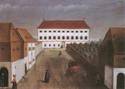 The Kranj theatre was built next to the Parish Church of St Cantius in the centre of the medieval town on a promontory between the rivers Sava and Kokra. Until the 1970s on the location of the present-day theatre there was a garden and orchard. The square between the church and the later theatre building began taking shape after the cemetery around the church was moved in 1790. In 1808, the school building located south of the church, the curacy and the sexton’s house, as well as the cemetery wall and the stone lighting pillar were also removed. That is when by widening the road between the church to the north and the presbytery to the east, a long rectangular square was created that on the southern side bordered on the large presbytery parterre garden. The latter is shown on the land register from 1826, created at the time of the reign of Franz I. In the mid-19th century a building called the bishop’s palace was built in the northern part of the garden, which closed off and formed a large proportion of the southern side of the market south of the church. The main façade of the building was created in the then very popular historic style. Inside, there were lodgings for the retired Bishop of Ljubljana Jernej Vidmar (1802-1883), who was born in Kranj and after retiring in 1875 spent the last years of his life there.