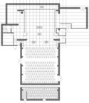 The ambitious alteration of the theatre frontage was linked to the foundation of the professional Prešeren Theatre on 8 February 1950. Soon after it was founded, between 1951 and 1953, the theatre earned itself the reputation of one of the most experimental theatres in Slovenia, as modernist dramaturgic elements were introduced into performances and a number of plays, especially from the Anglo-Saxon world, were performed here for the first time in Slovenia and Yugoslavia. However, the modest building soon began to hinder the development of theatrical activities. The auditorium behind the impressive frontage was limited and badly equipped, whilst the stage was very small. After the renovation of the frontage, the commitment to renovating the whole building seemed to wane. In 1957, the Kranj professional theatre was abolished. Between 1958 and 1989, an amateur theatre that was a part of the Svoboda drama section was initially housed in the building, whilst later the management committee of the Prešeren Theatre founded the amateur Prešeren Theatre Institute. In 1989 it once more acquired the status of a professional theatre. A number of partial renovation interventions took place in the building interior during this time, which were mainly of a utilitarian character and never changed the basic design from 1940. The auditorium has thus preserved the nearly square ground plan and a rather utilitarian shape. Today, it has 252 seats, of which 196 are in the stalls and 56 on the balcony. The auditorium opens to the equally wide stage section with a square ground plan via a 10-metre wide opening. At the side of the stage there are premises for the theatre staff and stage props. There is practically no indication on the exterior that theatre activities take place inside. This reflects the unusual development of this building.