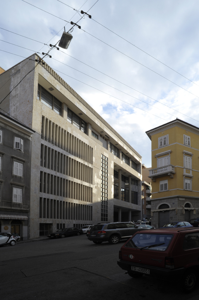 This is a complex and technically perfected building characterised by a non-conventional and modern approach. It encompasses an auditorium with a rotating stage, a social section and a study library with all the necessary auxiliary premises. A description of the theatre and all the technical details, including the complications, can be found in the brochure Kulturni dom v Trstu (The Cultural Centre in Trieste) from 1964 and the in a text written by the architect Marko Korošic Zamejski opus arhitekta Eda Mihevca (Architect Edo Mihevc’s Work Abroad), published in 2002. The strictly modernist façade gives the impression of a semi-open curtain where in the open, slightly set back section there appear two pillars, rising through all the floors. In contrast to the exterior, the interior is warm and rich, whilst the auditorium is curved with soft lines. With his ambitious design the architect provided an excellent response to the issues connected with the building’s intended use, whilst the monumental modernist building was in 1960s Trieste like a breath of fresh air.