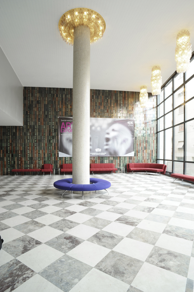 The existence of Slovenes in Trieste has throughout been linked to cultural activities and the attention given to the Slovene language. Efforts towards the building of the Kulturni dom began in late 1950. In February 1951 a committee was founded which began a campaign of collecting funds among Slovenes in Trieste, in Slovenia, in Yugoslavia and among Slovenes living in the USA. The first plans were created in 1951, the main plans in 1954 and the foundation stone was laid on 21 July 1957. Construction was finished just over seven years later. The building is the work of the architect Professor Edo Mihevc (1911-1985), who was born in Trieste and graduated under Jože Plečnik, and was very much in favour of modernist trends in architecture. His buildings, such as the Impex business complex (1953-57) and the business and the residential building Kozolec in Ljubljana (1955-57), as well as the Kulturni dom in Trieste (1964) show that he was well acquainted with the work of Le Corbusier, Walter Gropius and Mies van der Rohe. Olga Rusanov, his assistant in designing the Kulturni dom, says that Mihevc during the time before he drew up the plans travelled a great deal to Vienna and around Germany where he studied theatre buildings. He had his own way of tackling the tasks he was given and resolving any problems, says Rusanov, adding that he also had a very good mastery of space. Due to the small size of the plot the building is built on – 1900 square metres – he designed the theatre so that space was provided by its height, the balcony had very soft lines, whilst the ceiling in the auditorium and the foyer provided a pleasant ambience. The contact between the walls and the floor is executed in such a way that it seems as if everything is floating, which gives the impression of spaciousness and grandeur. The interior is decorated with works of art by Avgust Černigoj, Robert Hlavaty, Avrelij Lukežič, Jože Cesar and Klavdij Palčič, as well as with colourful materials, large chandeliers made from Murano glass, etc. A walk around the theatre seems like a homage to various donors and contributors.