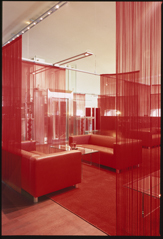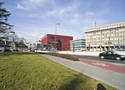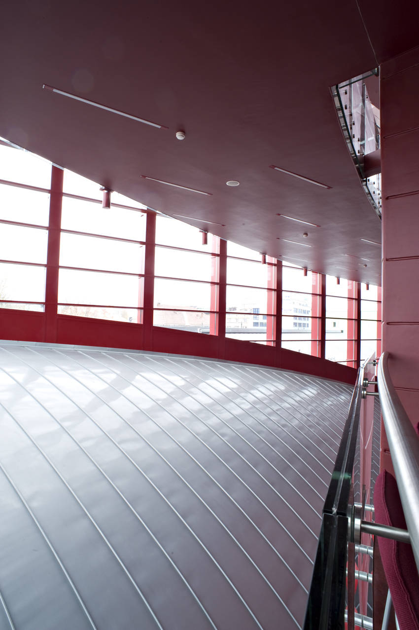 W drugim czerwonym gmachu zbudowanym głównie ze szkła, mieszczą się m.in.: główna szatnia, scena, pomieszczenia pomocnicze oraz pokoje do rozegrania. Scena i krótkie audytorium z dwoma poziomami balkonów zostało wpisane w kostkę głównej bryły o boku ok. 40 m. Dzięki wycofaniu widowni i sceny w głąb działki ochroniono budynek przed wpływem drgań generowanych przez przebiegającą ul. Lubicz linię tramwajową.